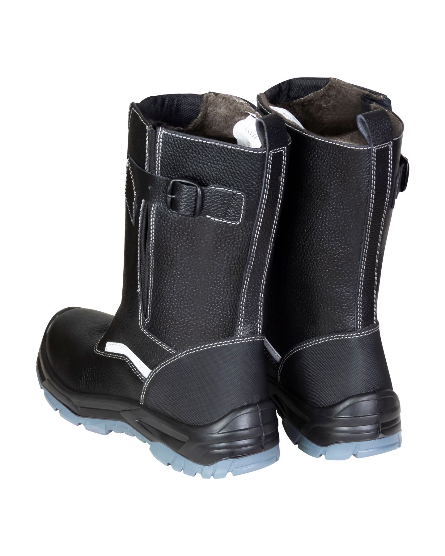 Сапоги из натуральной кожи и искусственных материалов, голенище регулируется пряжкой, высота сапога около 260 мм (от пола), основная стелька из штробельного материала, комфортная вкладная стелька из кожкартона дублированного волокниной, искусственный мех, внутренний металлический подносок до 200 Дж, удобная колодка анатомической формы.